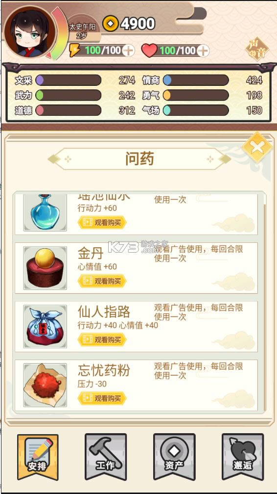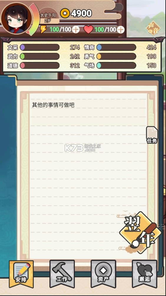 玩家需要适应当前的情况生存,让自己好好成长,玩家可以去找寻回来的方法,也可以以现在的身份来继续活下去。游戏中玩家将从婴儿开始冒险,有着文采、情商、武力、勇气等众多不同的属性,玩家可以选择文人、武者等不同的方向发展,注意提高对应的属性,你的每个选择对你的人生都是非常重要的哦,记得谨慎选择。