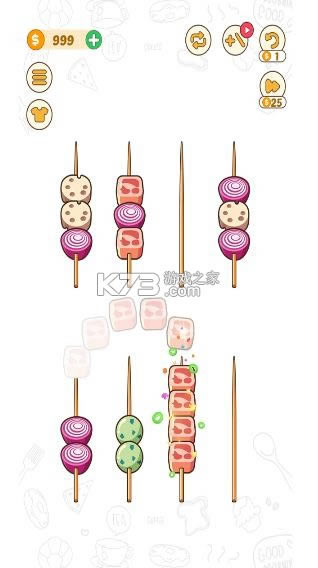 轻击任何竹签,将食材移动到另一竹签, 食材移动的规则是,只有相同种类的食材并且竹签上有空间时,才可以移动, 尽量不要卡住,但也不用担心,您随时都可以重来