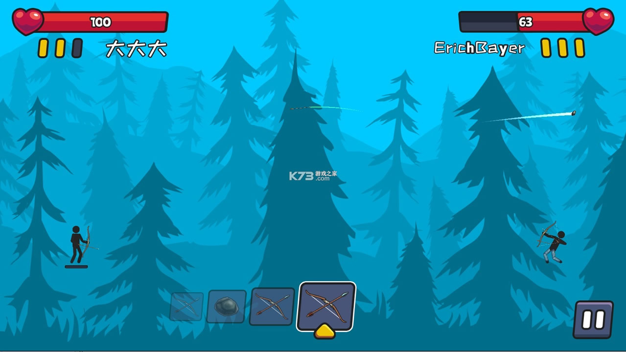 弓箭手英雄火柴人战争是最好的休闲火柴人决斗游戏!忘记所有相同类型的射箭游戏。你可以扔矛、花瓶、铁砧,甚至是皇家!你认为仅此而已吗?不,游戏中有许多不同的武器!在这个游戏中,你会遇到这样的模式:有趣的战役、PVP、无尽模式、两个玩家的游戏。