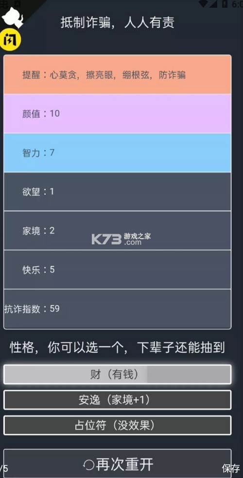 人生难免被骗,但是我能重来啊,经历九九八十一重诈骗我已经学会如何防诈骗,在这个世界里想要再骗我是不可能的,哎哟我去怎么有第八十二种诈骗方式!可恶我只要再玩几次就不怕了。