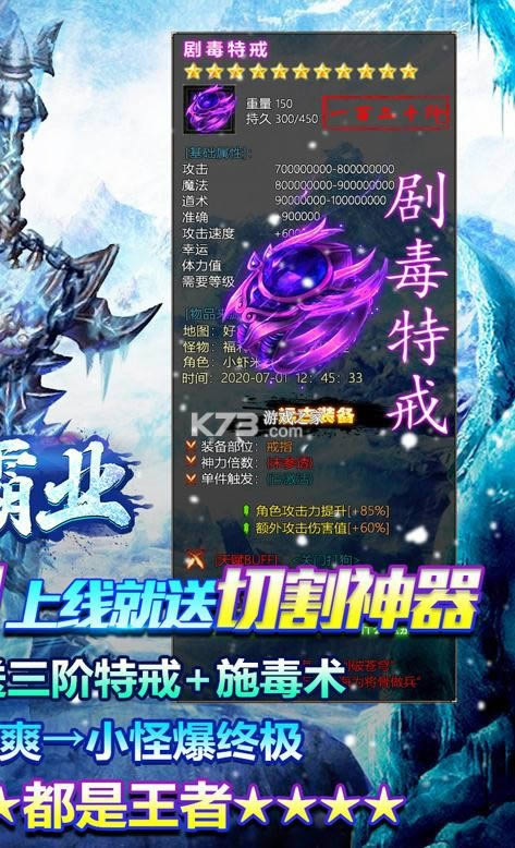 《王者霸业-新冰雪三国》复古冰雪版本,开局就送新手福利!超高爆率!超强斩杀!助你砍遍全图!全新地图,三国神器,活动boss无限刷!