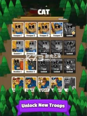 比较有意思的是这个游戏中的所有角色都是一些可爱的猫咪,而玩家要做的就是搜集各种猫咪组建成为一只军队,然后指挥自己的猫咪军队去和其他的军队进行战斗,还是比较考验玩家的指挥能力的哦。