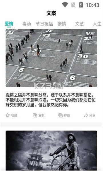 2、自带图文搜索功能,并按生活自拍,早晚安问候,微商文案,实用百科,素材配图,励志正能量,心情感悟,搞笑有趣,节日祝福等分类对朋友圈热门资源进行整理归类,让您能迅速找到您所需的素材。