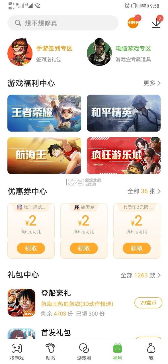 然后进入4399游戏首页搜索想要领取皮肤、礼包的游戏,点击福利,即可看到礼包皮肤详情了