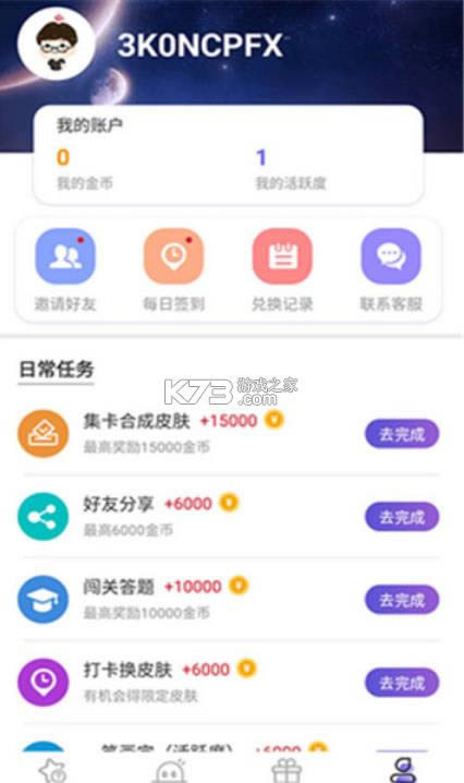 随时使用本软件完成各种任务,得到大量奖励,可以兑换各种皮肤。