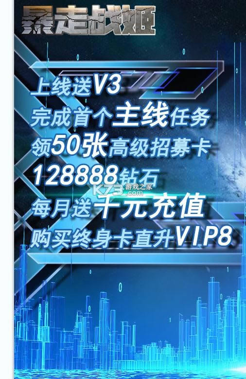 1.上线送V3,完成首个主线任务送50张高级招募卡,128888钻石