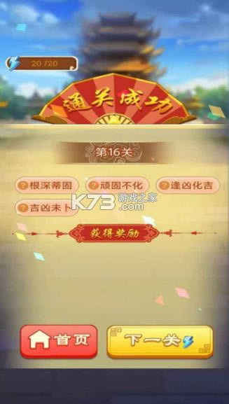 每个关卡都会给出特定的填字题目和一些提示,而玩家需要通过分析或者猜测想出空出来的位置应该填入什么样的成语,正确的填对所有的成语就可以顺利过关了。