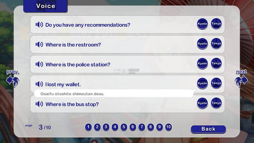- 包括一个模式,玩家可以学习的问候语和短语在两个标准的日语和京都方言。