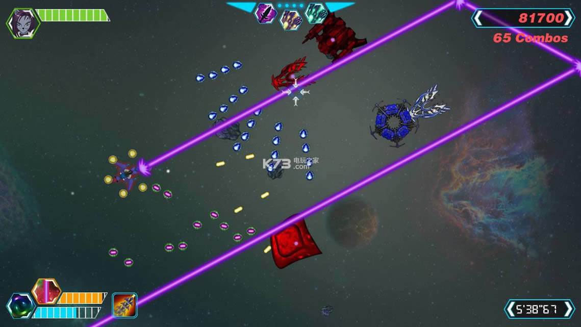 跟一般的弹幕游戏不同,BOSS并不是在关底等着跟你单挑,而是混在杂兵中出现。在跟BOSS周旋的同时确保连击数不中断会是一项很有意思的挑战。游戏中还会出现一种特殊的陨石,用正确的姿势击破它能获得有益加成,反之会导致你的防御力大大降低。在关卡尾声包围你的敌人会增加,不冷静应对的话很容易在这里功亏一篑。