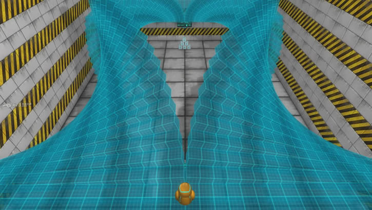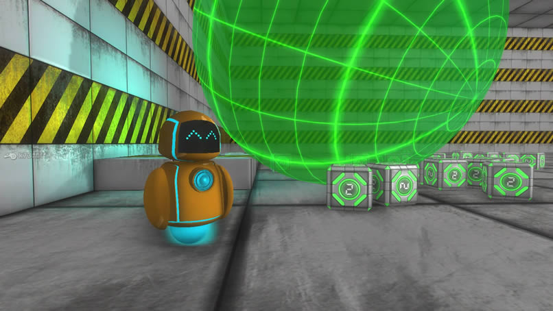 本作中,玩家要做的就是通过房间中无规则运动的球体来推到箱子,而倒下的箱子上发光的数字可以增加机器人的弹药数量从而推倒更多的箱子。