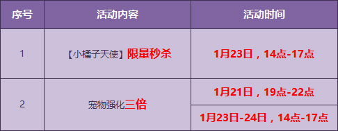 活动时间:1月21日19点-22点,1月23日-24日14点-17点,更有宠物强化3倍开启,千万不可错过!