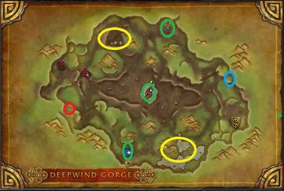 很不幸,当我截图的时候,正好有一辆载具位于地精金矿。你可以看到玩家们都聚集在地图上方的熊猫人金矿和地图中央的中部金矿,而蓝色载具所处的位置就是地精金矿。我把所有的矿坑都用绿色圆圈标注了出来。联盟和部落的基地有着他们各自的阵营标志,而蓝色和红色的圆圈标注的地方就是双方的墓地。后面我会详细解释黄色圆圈标注的区域。