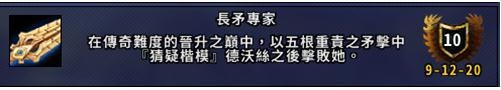 在传奇难度(史诗模式)的晋升之塔中,以5根执政官之矛击中疑虑圣杰德沃丝之后击败她