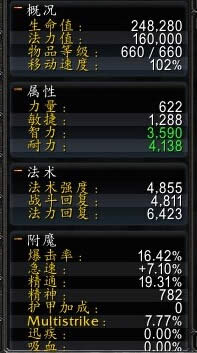 奶德专精下,600PVP装备下的面板没有吸血,坚韧等数值,这两项应该也是针对坦克职业的属性,暂时没有测试。