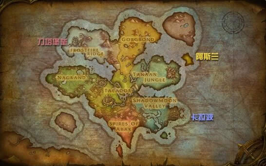 刀塔堡垒和卡拉波,一个在西北一个在东南,看似地图的两极,但考虑到德拉诺的世界地图有很高的对称性,这样也很方便设计内容,其实一旦内容设计得当,玩家也就不必跋山涉水。但是当主城都集中在位于最东边的阿斯兰时,问题就来了,假如你想去纳格兰怎办?对于部落玩家可能会说我先回要塞,那对于联盟玩家呢?