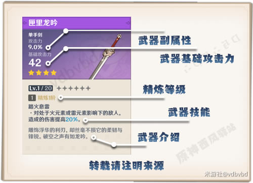 武器信息页从上到下依次是武器名称、武器类别、武器面板、武器星级、武器等级、突破等级、精炼等阶、武器技能、武器简介。(二星级及以下武器无副属性与武器技能)