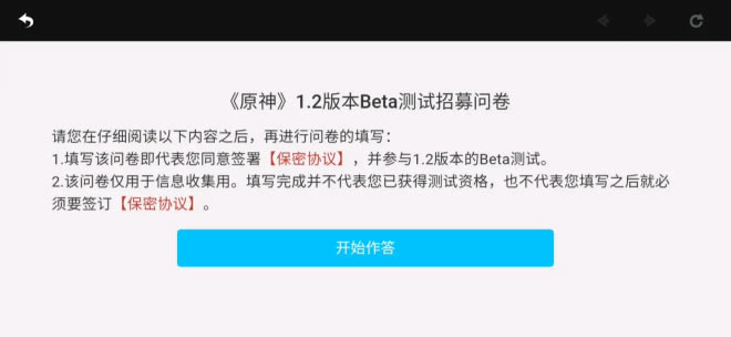 这是《原神》1.2版本Bata测试问卷界面,有保密协议进去就可以开始填了