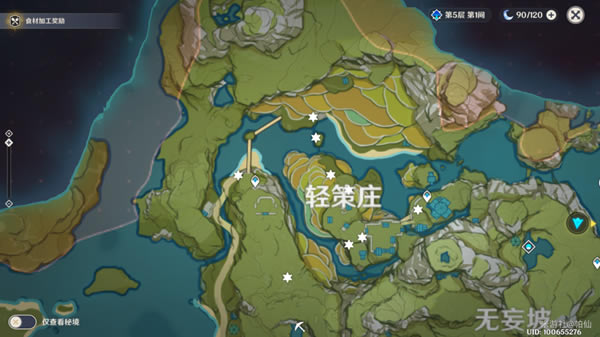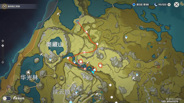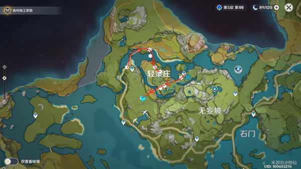 注意,红圈出的点在山上,时间充裕可以过去采集,上山大约需要200体力(全程跳着上去),如果是日常收集,可以略过直接去下一条路线。