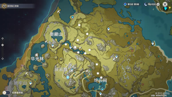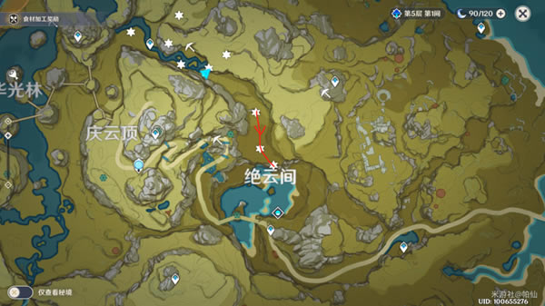 绝云椒椒一株三个,非常显眼,所以找寻起来也很容易,下图为自己今天踩点走过的一遍路线,路线几乎不需要爬山,熟练情况下可以5min收集到60个左右绝云椒椒,顺带几个水晶矿。