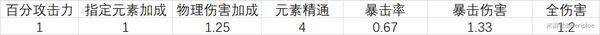 本贴通过将所有增伤转化为攻击力来折算收益,固定攻击力暂不考虑,特殊增伤(如防御力对女仆的增伤)暂不考虑,全伤害由于与物理伤害以及元素伤害相加,暂定系数为1.2。这里给出比例: