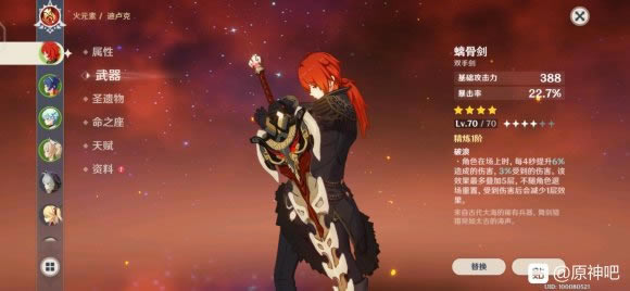 5,螭骨剑的技能不是很适合卢姥爷,毕竟受伤就会掉层数(点草地也会受伤),不过考虑到后期多数下本,和深境螺旋没有草地,还是可以用的+6%伤害+3%受到伤害最多5层很可观,而且6%是所有造成的伤害,包括火伤/物理等。