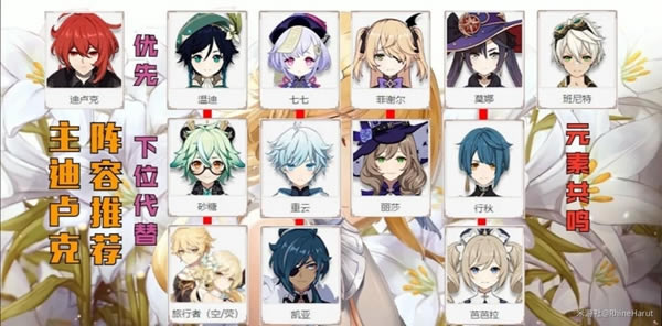 迪卢克主C时,可带温迪,七七,莫娜,菲谢尔,也可带班尼特触发元素共鸣