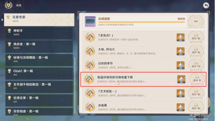 成就名为:低温环境导致可用电量下降,要求再2秒内,通过超导反应打败4名敌人。这是一个让玩家们怨声载道的成就,痛苦就痛苦在,必须是电元素打到冰元素上,触发超导反应造成的伤害而导致击杀才被计算进去,直接用技能电死是不符合要求滴。
