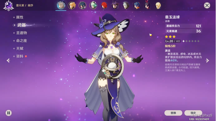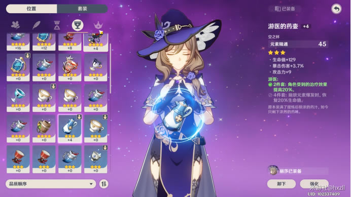 给丽莎佩戴完圣遗物后,她的元素精通应该要来到一个180~200的区间(武器也要元素精通,别带错了!)这时候看起来还是比较低的,但没关系,我们还有工具人提供加成。