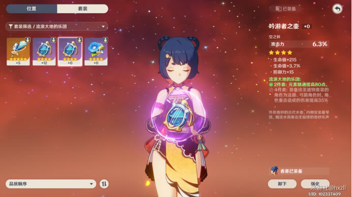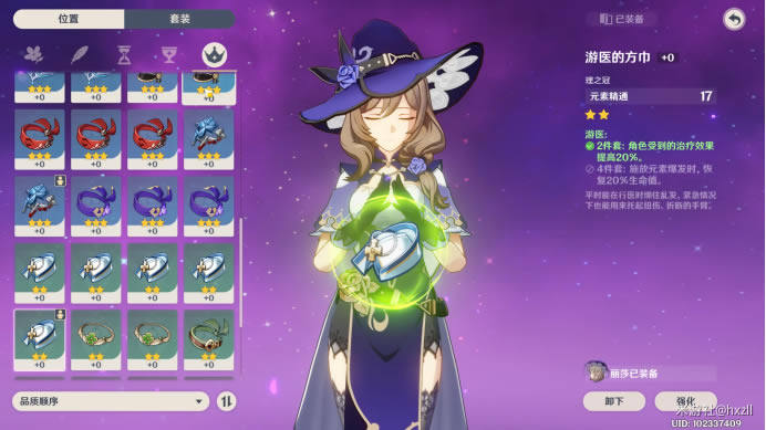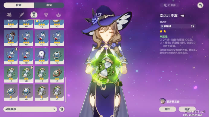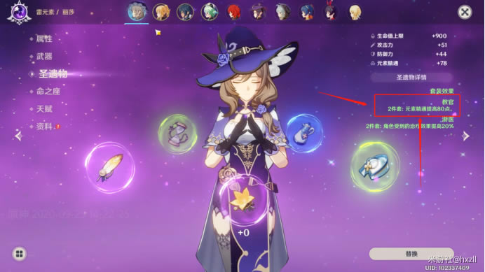 圣遗物配装思路就是拉高元素精通,越多越好,只要主词条是元素精通的圣遗物,不管蓝色还是绿色,都是可以拿出来先装上的。然后有两个套装在这里是起到非常关键的效果的,分别是:教官套和流浪大地的乐团套。两者都可以为佩戴角色提供80点元素精通,很多时候比用蓝装绿装东拼西凑要好得多。楼主这里只携带教官套也是轻松过,有条件的两套都给丽莎带上最好。