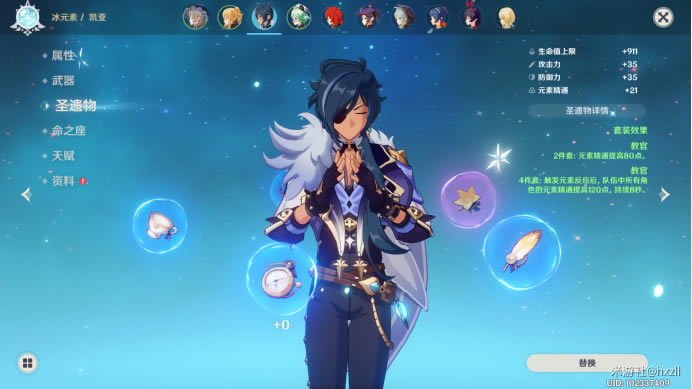 这里凯亚一定是选择教官四件套,效果为:触发元素反应后,队伍中所有角色的元素精通提高120点,持续8秒。非常质朴又强力的提升,作为工具人套装给丽莎做铺垫再合适不过了。