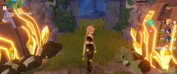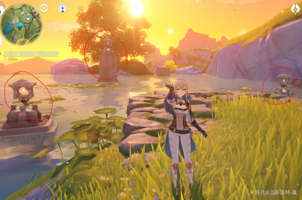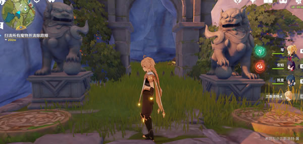 石狮前有2个触发机关,单人的话小技巧用岩主放桶比较简单(其他角色也可以就是技能持续时间比较短)。