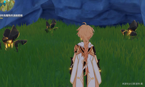 在这里可以看到3个岩晶机关,一个铁闸门,两个石狮,(几个冰史莱姆清掉就好了)。