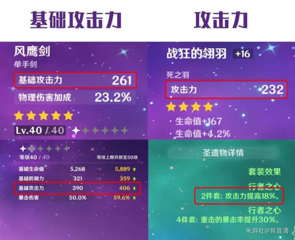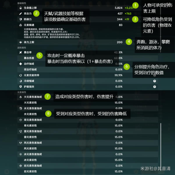 白字部分(基础):基础生命值、基础防御力、基础攻击力,其中基础生命值和基础防御力来源于角色成长时获得的属性提升,而基础攻击力则不仅随角色等级&突破提升,还可以从武器升级&突破途径获得