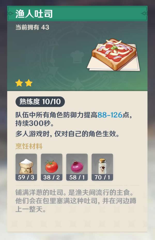[摘要]在原神的世界中,给角色增加buff和恢复体力的物品是以食物存在的,制作这些食物需要先找到对应的食谱,下面给大家推荐一些比较实用的食谱和其获取的方法,一起来看看吧。实用食谱推荐及获取方法分享 渔人吐司...