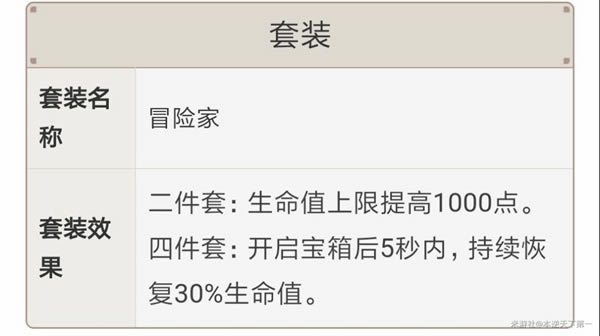 评测:2冒险家给了一个相对于前期来说比较高的一个生命值,而4冒险家的效果则是为前期的探险续航做了强力保障。[前期没开的宝箱较多,开箱回血较简单]