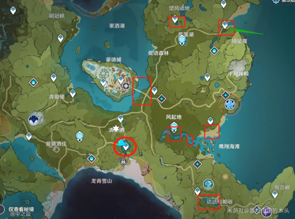 蒙德地图:对上面八个点,传送过去都能看见鸟,上弓射、每次过得2~3个(总有一个飞跑了)而且有传送点、10分钟采集其他资源顺路拿走。