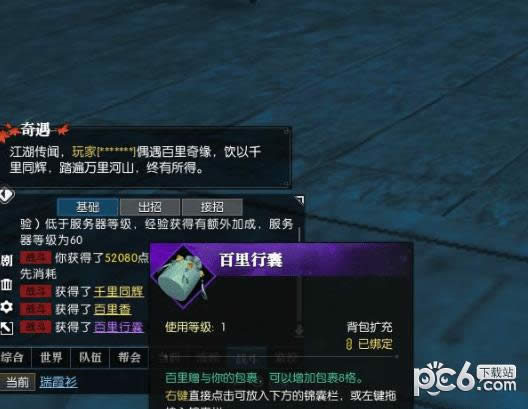 首先告诉一下大家,这个奇遇大概花费15分钟做完,获得的奖励除了上面的8格背包,还有一个追风翼。追风翼的作用类似于我们的回城技能,不过这次我们可以自己绑定一个回城点,然后以后每次 去这个地方就很方便了。比如说楼满花这里我们需要来回跑,就可以设置成回城点。