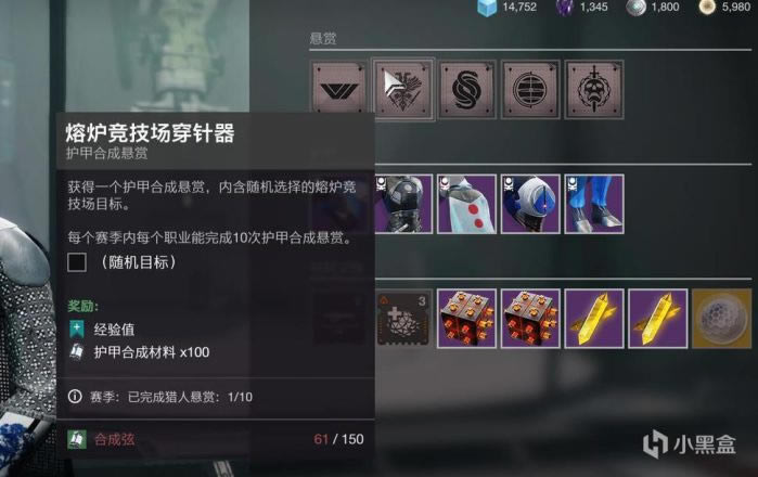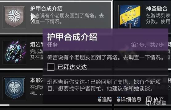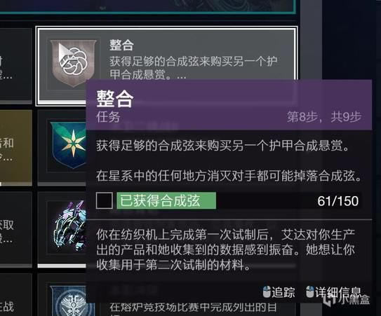 我们的流程是:完成任务获得材料合成弦——再用合称弦换取护甲合成材料的悬赏——完成悬赏获得合成材料——去艾达旁边的缝纫机(我就这么叫了)合成转换护甲皮肤材料合成纤维带条——最后去上述界面解锁护甲皮肤。