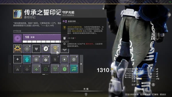 最后屁帘依旧选择守护光能,因为装了元素充能的缘故,所以每次触发至少是两层充斥光能的守护光能