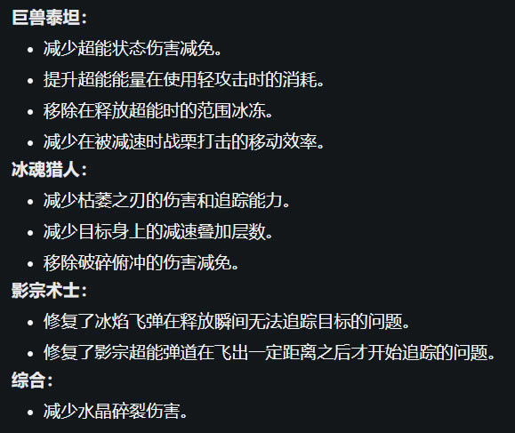 5.冰系平衡:泰坦大招效果整体削弱,猎人飞镖伤害减弱,X取消减伤效果,猎人减速层数削弱,冰术士跟踪效果加强,全体破冰伤害减弱(人均一刀,不是针对谁