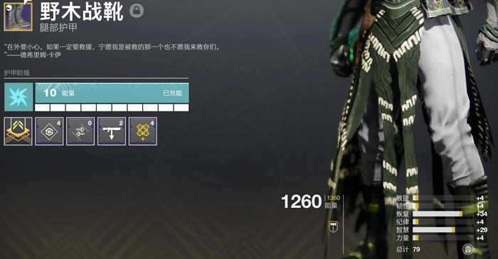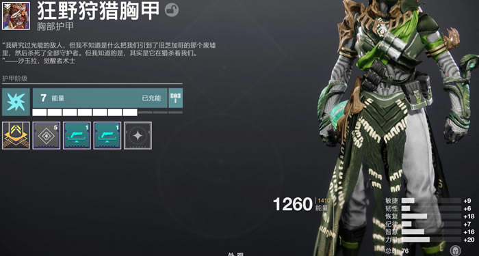 胸甲没什么好说的,两个赛季神器手炮抗性模组,留出来的一个模组位置大家可以选择层层不绝(每次充斥光能时都会额外赋予一层充斥光能)精准充能(手炮的快速精准击杀使你充斥光能)由于这里我没有,就不演示了,也可以选择强力伙伴或者辐射光能等等等等