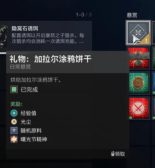 这里任务要求的曙光精神,推荐把日常悬赏接了做完,跳成就时也记得点也有曙光精神奖励,同时还推荐曙光节周常和3000微光额外悬赏一起做见下面第6章(图)以节省材料