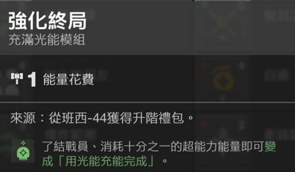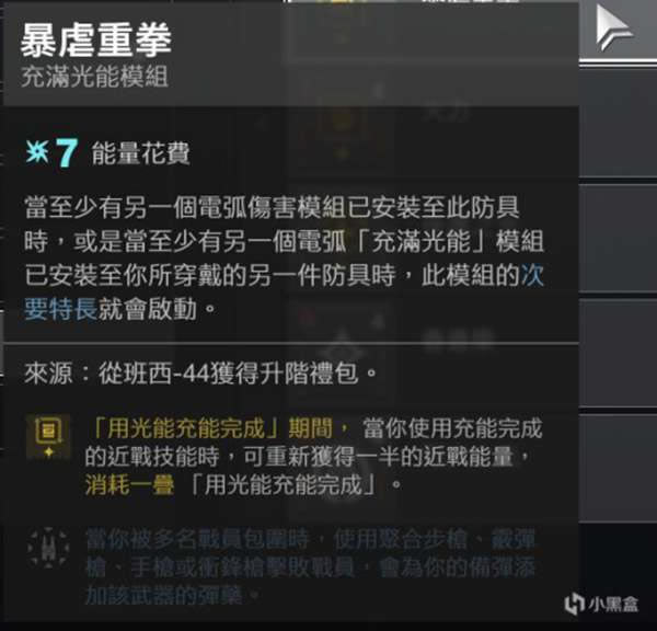 1.通过暴虐重拳模组的第一个效果,角色将消耗一层充斥光能buff来获得一半的近战能量