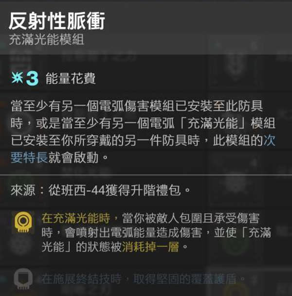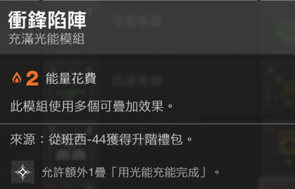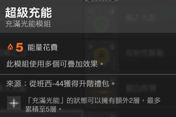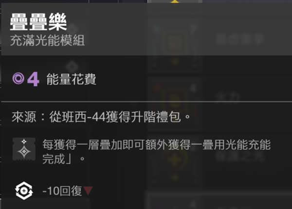在只需要一个让角色获得充斥光能模组就足够的情况下也可加一个叠叠乐模组(简体:层层不绝:获得一层充斥光能的情况下额外给予一层充斥光能)来加速达到五层充斥光能的情况。