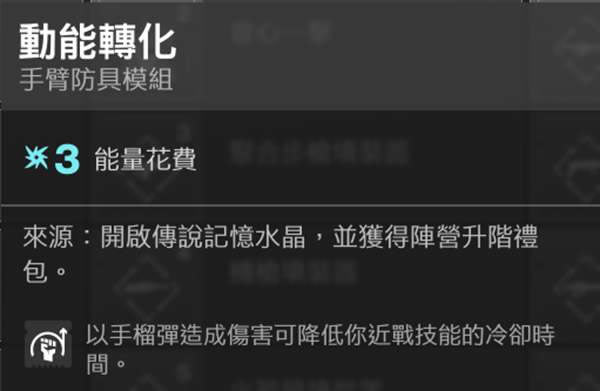 由于虚空下猎人对自己和队友使用烟雾弹时能给予自身部分手榴弹能量和使用手榴弹攻击敌人会获得近战能量的特性,我们可以在手臂上再打一个动能转化模组(简体:动量转移,手榴弹造成伤害会降低近战充能的冷却时间)来加快近战的回复。