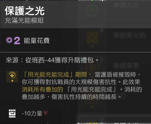 由于该配装强烈依靠充斥光能buff,个人觉得与保护之光(简体:守护光能,充斥光能的时候,如果护盾被摧毁,所有充斥光能层数将转化为暂时性的伤害减免,层数越多,伤害减免时间越长)冲突比较大(个人意见)。