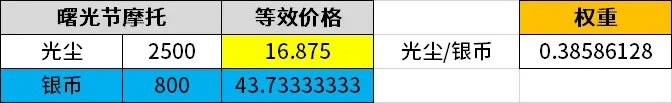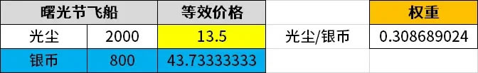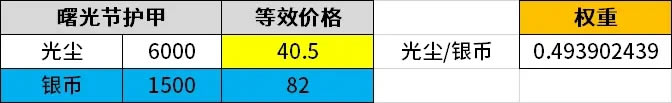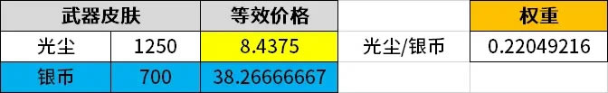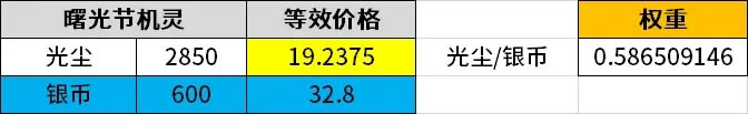 权重越小越适合光尘购买,权重越大越适合银币购买