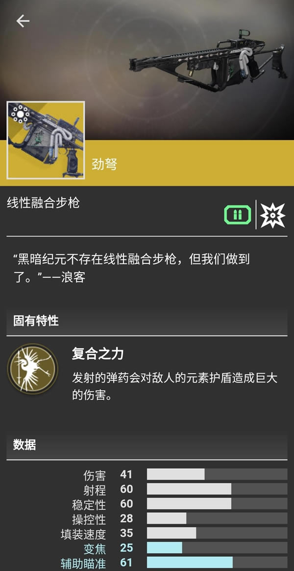 主手位融合步枪。劲弩真的是现在破元素盾最优选了,在主手位,不受元素限制,而且固有特性是直接对元素盾造成高额伤害,我建议开荒的时候有两个人带上负责破盾比较好。