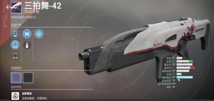 副歌-23升级版,同一个模型,依然拥有中倍率变焦57镜,跳弹,狂暴,可以大师随机+5点属性,优点是perk固定,获取方便(班西-44处获取升级包/世界掉落)缺点是不能装备额外模组
