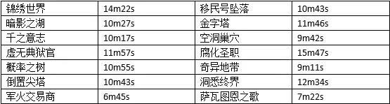 接着你需要进行时间试炼,也就是像梦魇狩猎那样的。这个时间要求是隐藏的,我会在下面用一张表来说明。然后你在打完这些要求后还需要把总时间控制在120min内,这样这张名片才会开始掉落,注意是掉落不是必给,所以你需要不停压缩时间来回刷,这里我就要说一句:棒鸡nms嘞!!!